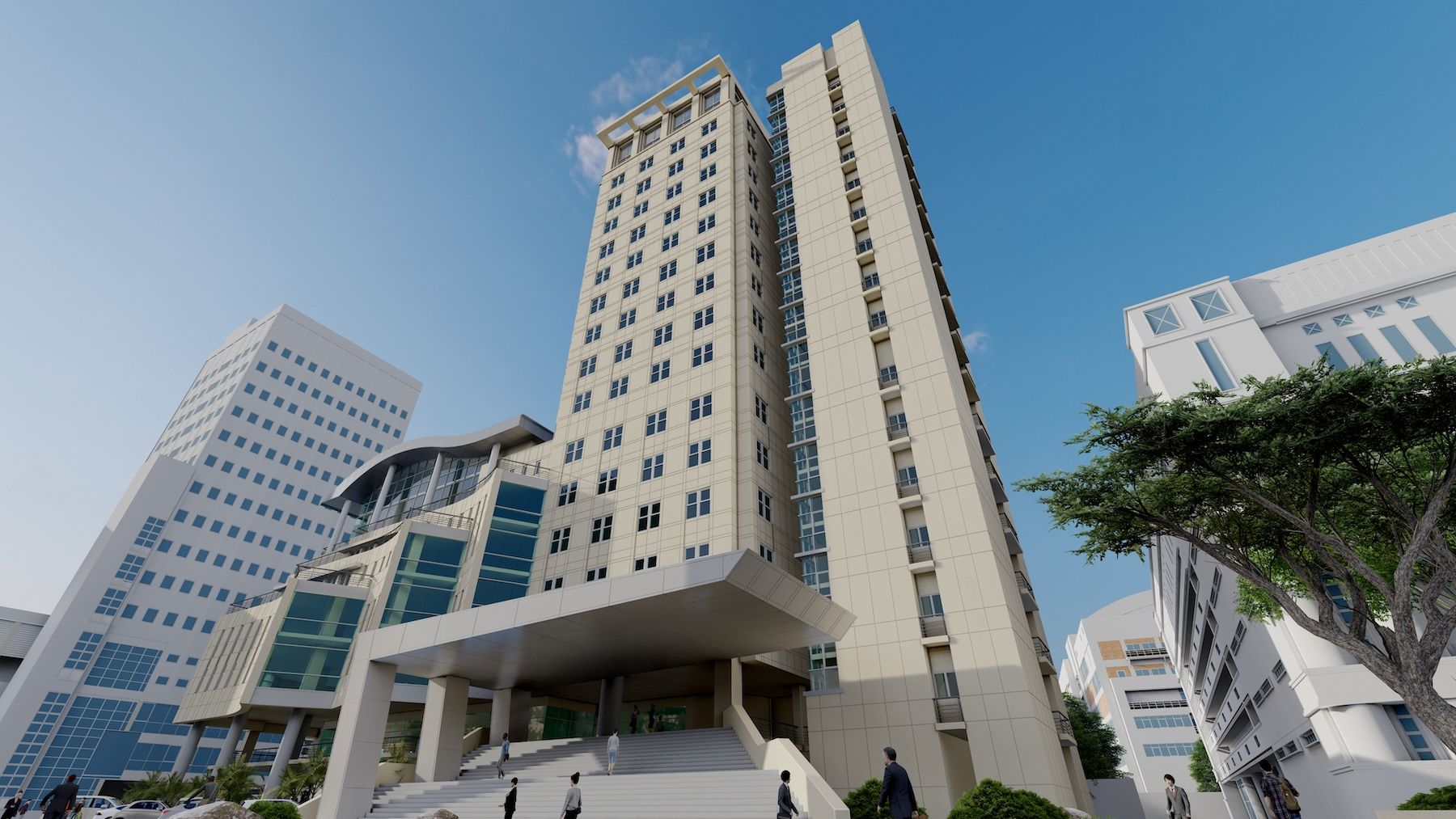 With site flanked by a 14-storey building and 7-storey office, the design of this new central library has to not only provide a smart solution of two different functions, classroom and library, but also minimize impacts over two existing buildings. The solution is to place a lower portion of building adjacent to the existing 20-storey building and locate a service core, with smaller profile, near the 7-storey office. The lower levels have to separate circulations from those using the classrooms and the library, as well as connecting the two existing buildings.