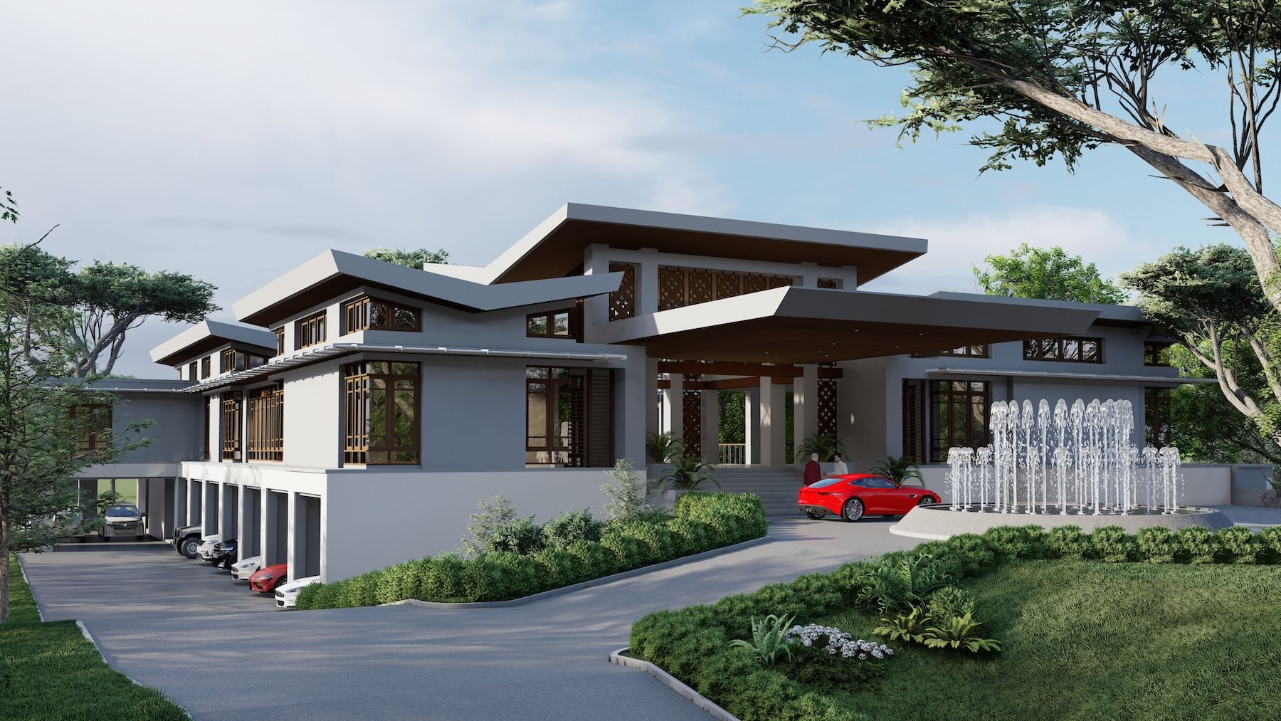 The program calls for a, very large, house that contains four residential units within the compound. Our criteria is to achieve in not only providing privacy for each unit, but also carefully and beautifully grouping them together. This was done by create an entry pavilion unifying the whole compound. This pavilion, situated on upper level and reached via bermed-up ramp, will serve as a reception area as well as a lobby for a formal gathering guests. Located immediately next to the pavilion is a large tropical reflecting pond, underneath of which houses a game room, mini-theatre and supporting facilities. Service facilities are located on ground floor. Exterior facades are cladded with Spanish sandstone, flame-finished granite with teak wood screen and window.